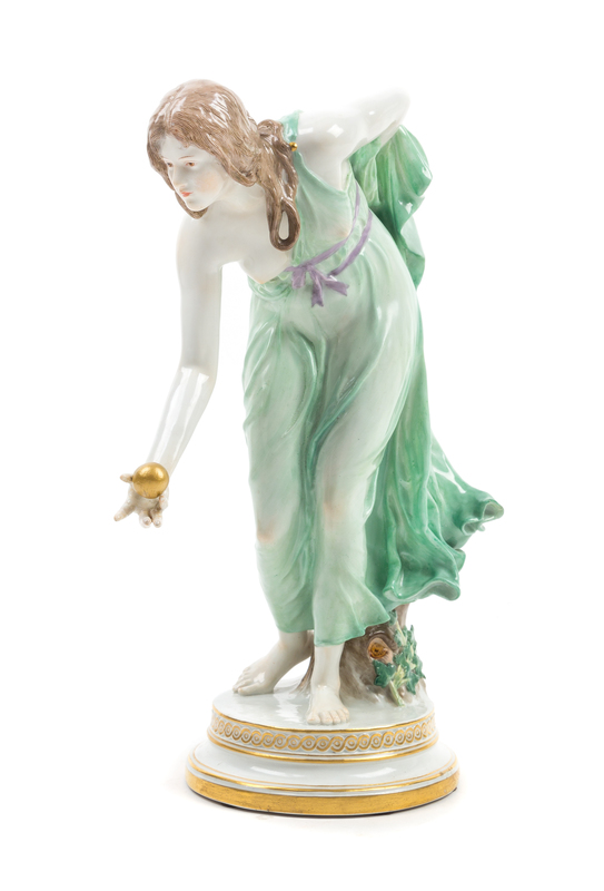 Kugelspielerin, with crossed swords in underglaze blue, incised Q180 and impressed 58 to the underside.