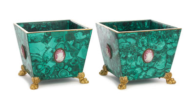 A Pair of Gilt Bronze and Cameo Mounted Malachite Jardinieres