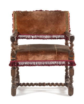 having a rectangular velvet upholstered back and stuffover seat within open twist-carved arms, raised on turned legs joined by twist-carved stretchers.