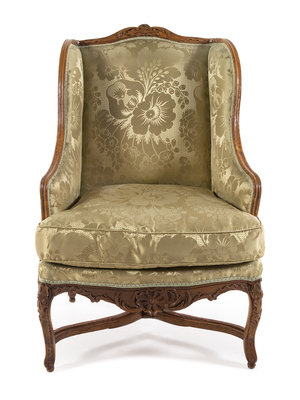 having a foliate and rocaille carved crest rail above the silk damask upholstered back, sides and cushion seat, raised on rocaille carved cabriole legs joined by a curved X-form stretcher.