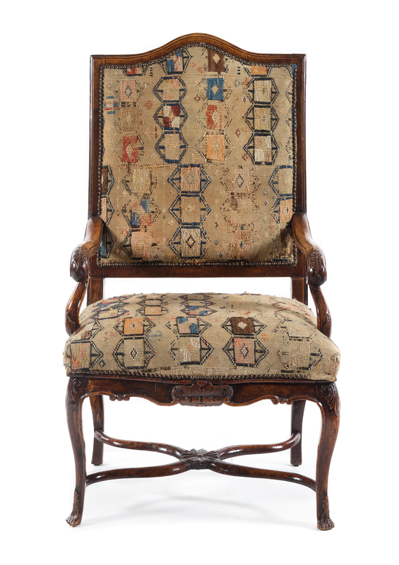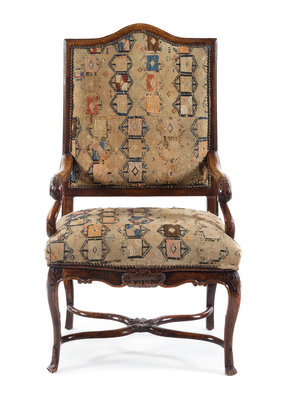 the domed padded back and stuffover seat with needlepoint upholstery, raised on foliate carved cabriole legs joined by an X-form stretcher.