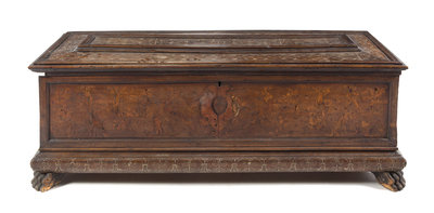 the hinged rectangular top inlaid with foliate scrolls, the conforming case inlaid to show cherubs, various figures, dragons and foliate scrolls, raised on paw feet.