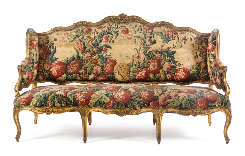 having a floral carved serpentine crest rail above the padded back, arms and stuffover seat of serpentine outline, raised on floral carved cabriole legs ending in scrolled toes, upholstered with Beauvais tapestry depicting exotic birds among flowers.