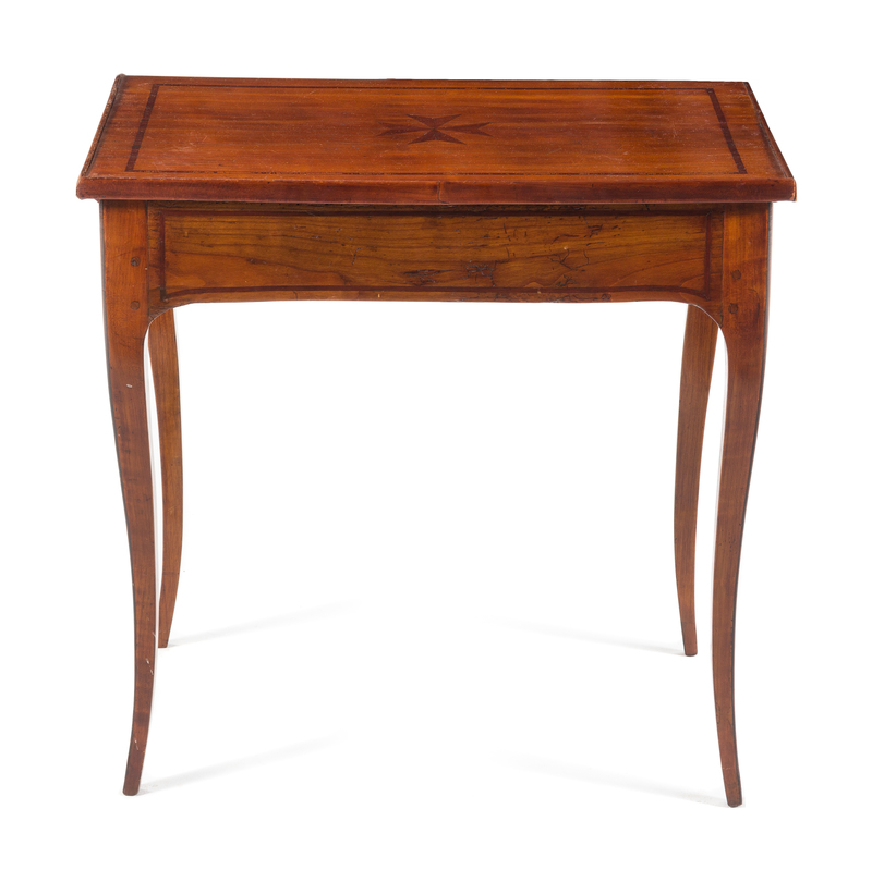 having a rectangular top inlaid with a Maltese cross, the plain frieze fitted with a single drawer and a slide, raised on cabriole legs.
