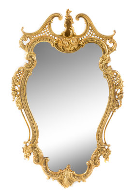 each of cartouche form, the pierced latticework crest cast to show a central shaped cartouche flanked by S-scrolls, the conforming frame cast to show latticework, floral sprays and rocaille.