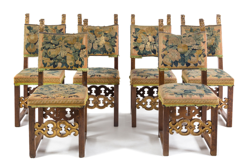 A Set of Six Italian Baroque Parcel Gilt Walnut Side Chairs