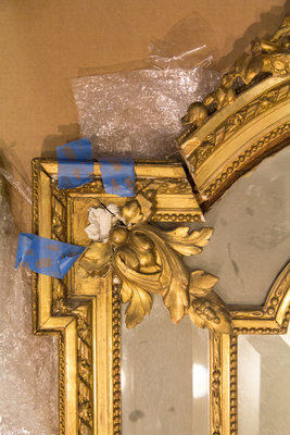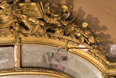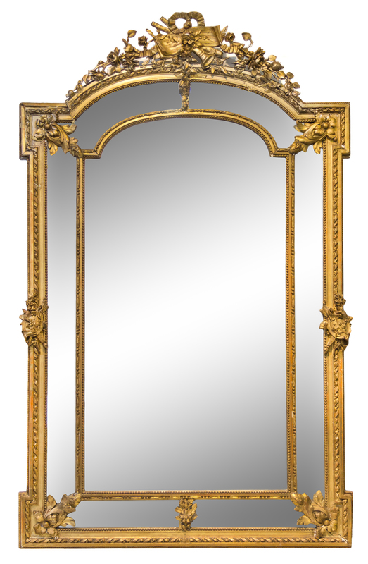the crest centered with a ribbon tied musical trophy flanked by flowering vines above the shaped segmented mirror plate within the conforming frame, carved throughout with beaded borders, trophies and floral decoration.