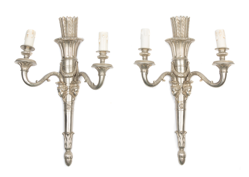 A Pair of Louis XVI Style Silvered Bronze Two-Light Sconces