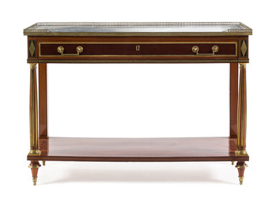 having a rectangular three-quarter galleried marble top above a single frieze drawer, raised on cylindrical fluted tapering legs joined by a medial shelf and ending in toupie feet.