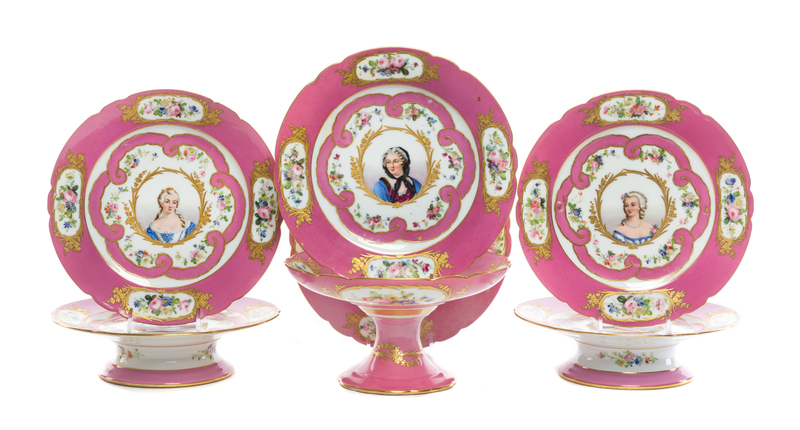 Rose-Pompadour pattern, comprising three compotes in two sizes and four plates, each centered with a portrait of a member of the French court, with interlaced Ls centered with an LF, further marked with the Louis Philippe monogram to the underside.