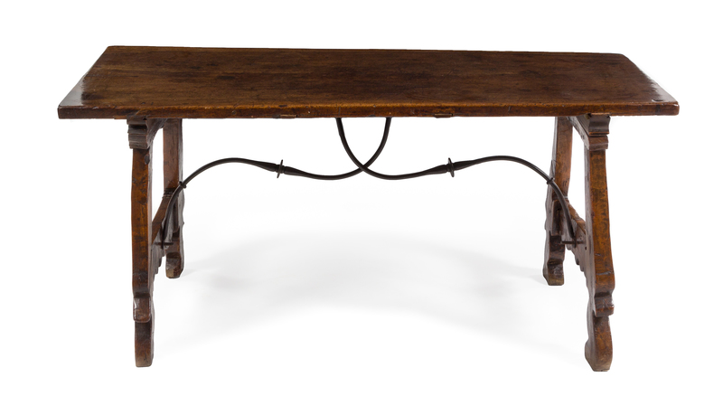 having a rectangular top raised on twin supports joined by knopped iron stretchers.