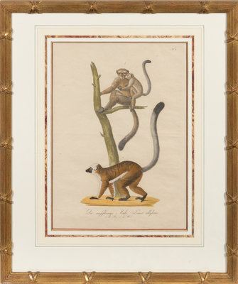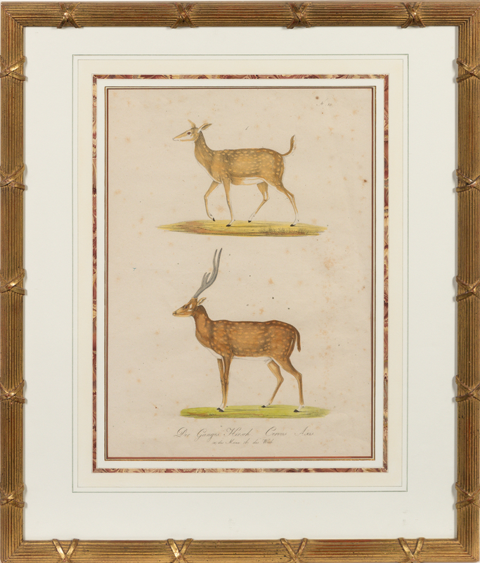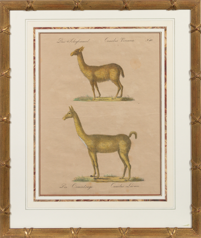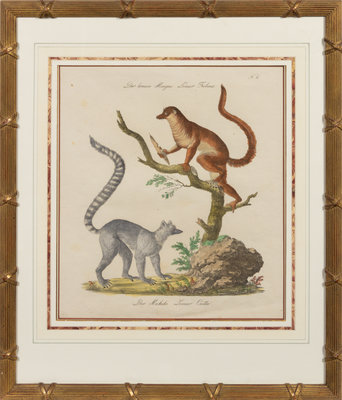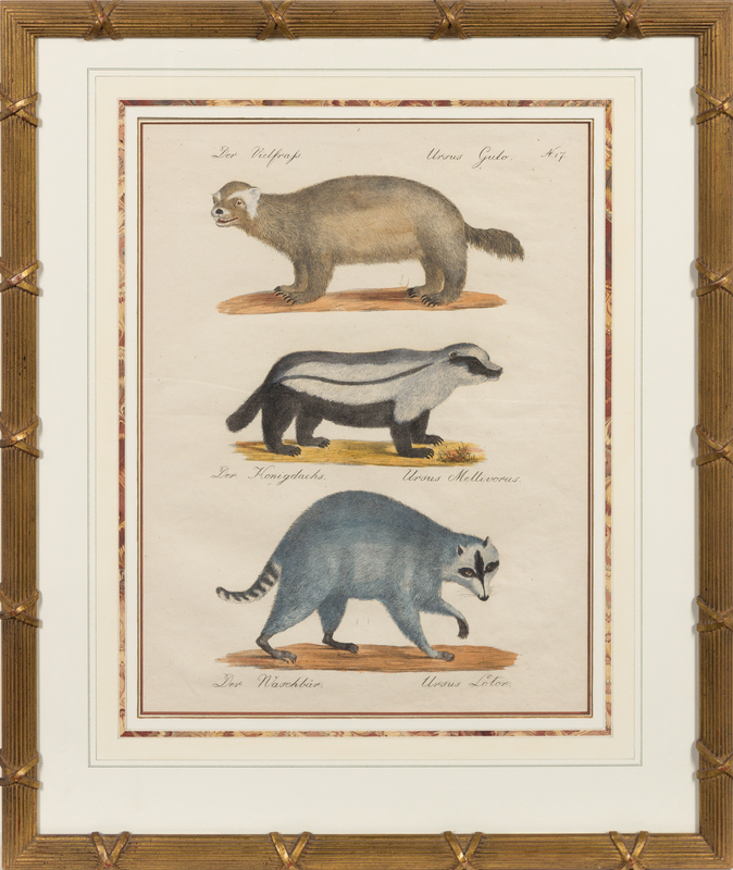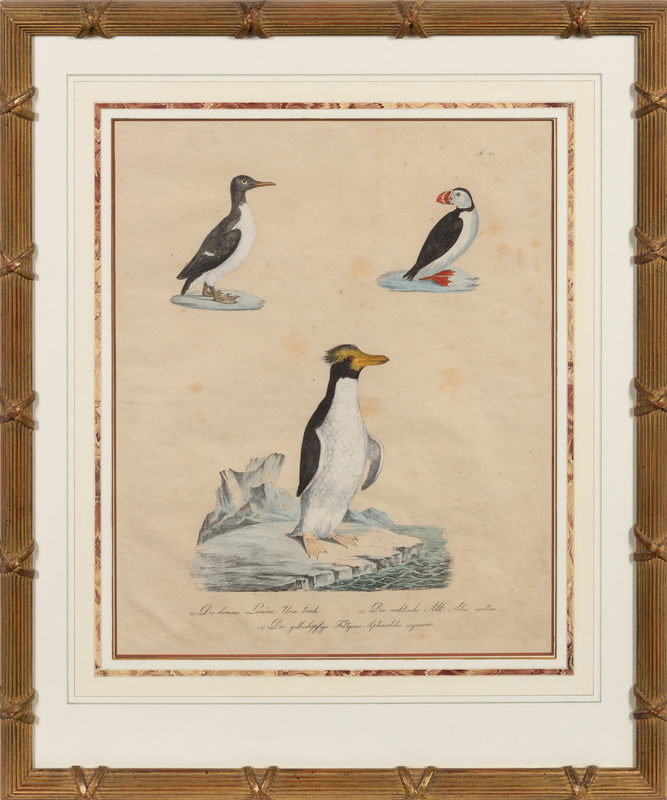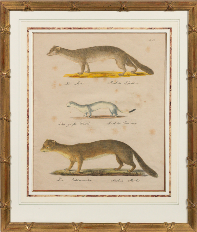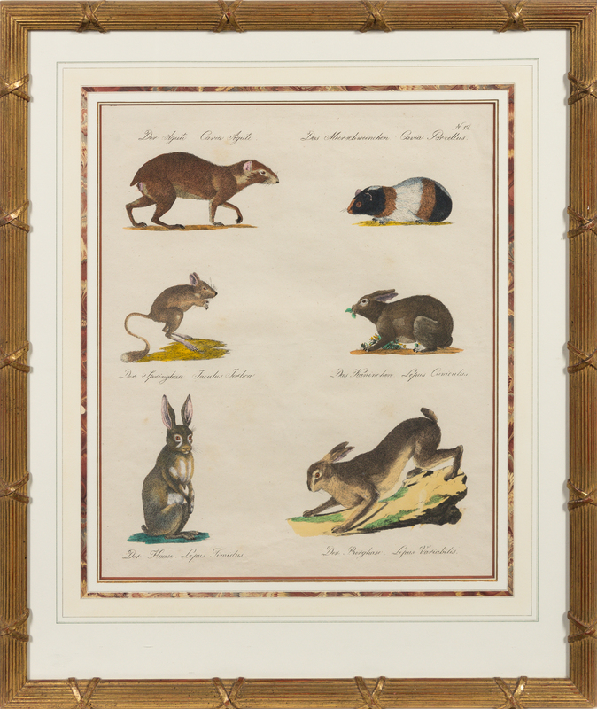 seven examples depicting various species of mammals, one depicting birds, matted uniformly with giltwood frames.