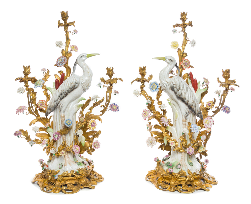 each in the form of a crane among porcelain floral-mounted foliate cast candle arms.
