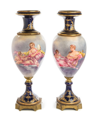 A Pair of Gilt Bronze Mounted Sevres Style Porcelain Urns