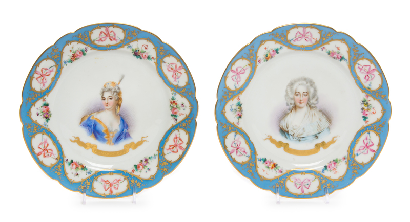 depicting the Duchesse du Maine and Marie de Savoie within a celeste-bleu border of ribbons and floral sprays, each with interlaced Ls in underglaze blue to the underside.