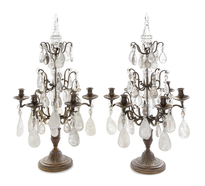 A Pair of French Bronze and Rock Crystal Six-Light Girandoles