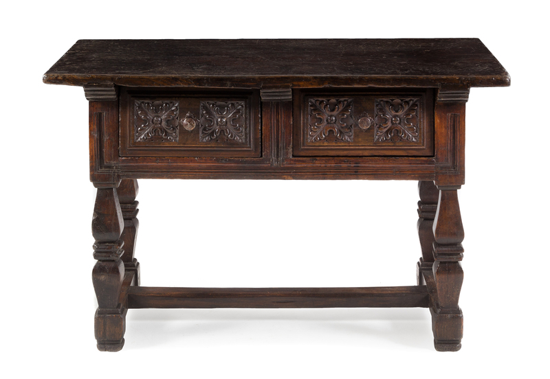 having a rectangular top above two foliate carved frieze drawers, raised on faceted baluster form legs joined by an H-form stretcher.