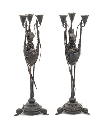 each cast to show a bird nestled within the three branches, the circular bases ending in snail form feet.