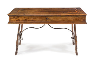 the rectangular hinged top opening to a fall-front and an interior fitted with drawers, raised on twin supports joined by knopped iron stretchers.