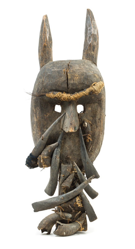 the brow mounted with a twine-wrapped tusk, the jaw and chin mounted with plain tusks, further applied with hair, shells and nails.