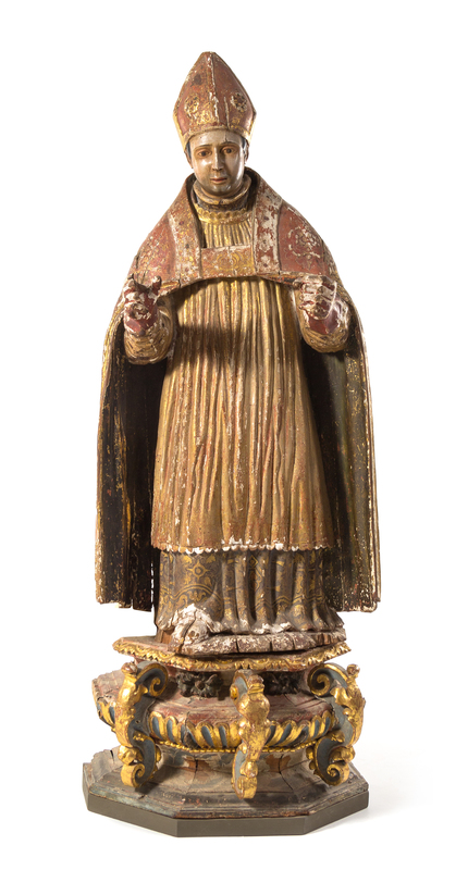 raised on a parcel gilt shaped base carved to show foliate S-scrolls.