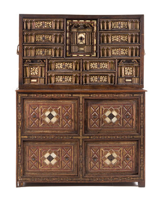 A Spanish Painted, Parcel Gilt and Bone Inlaid Oak Vargueno