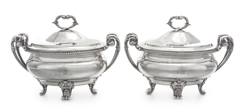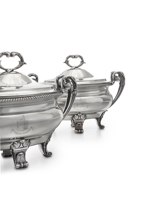 each domed lid having an addorsed foliate C-scroll finial and engraved with the coat-of-arms of Thomas Penrice of Yarmouth, County Norfolk bearing the motto Tute et Celeriter, the body with twin foliate capped handles and a gadroon rim above a conforming coat-of-arms, raised on foliate volute feet.