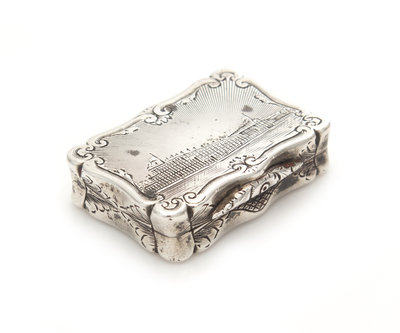 the lid depicting a view of The Crystal Palace, opening to a screened interior.