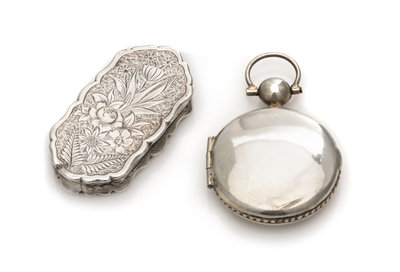 the case engraved with floral and foliate decoration, together with a circular Continental silver example.
