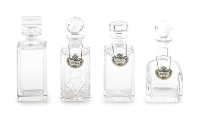 of handled oval form, together with four glass decanters and three Coalport liquor tags.