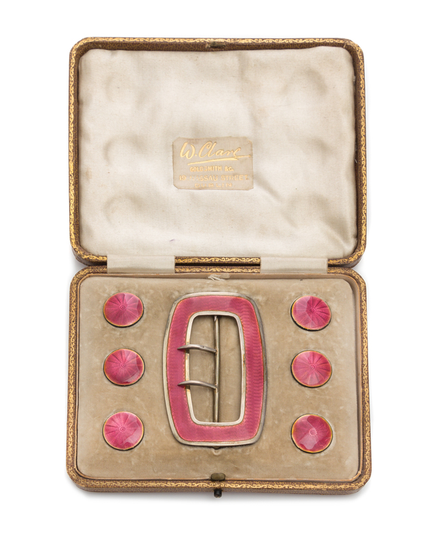 comprising six buttons and a buckle in a fitted box.