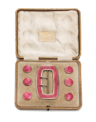An Edwardian Guilloche Enameled Silver Buckle and Button Set