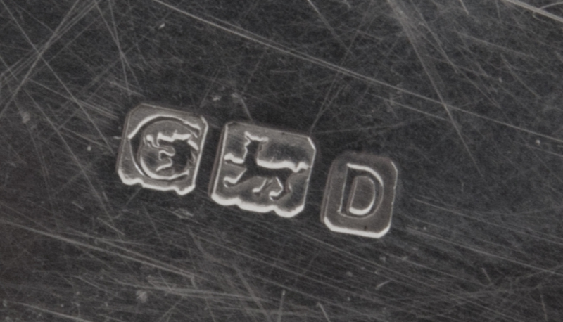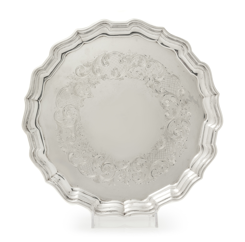 having a scalloped rim and border, the field with engraved floral, foliate and lattice decoration surrounding an erased monogram.