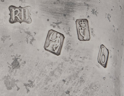 the beer jug in the Georgian taste and of baluster form, the six beakers having everted rims and a fitted case.