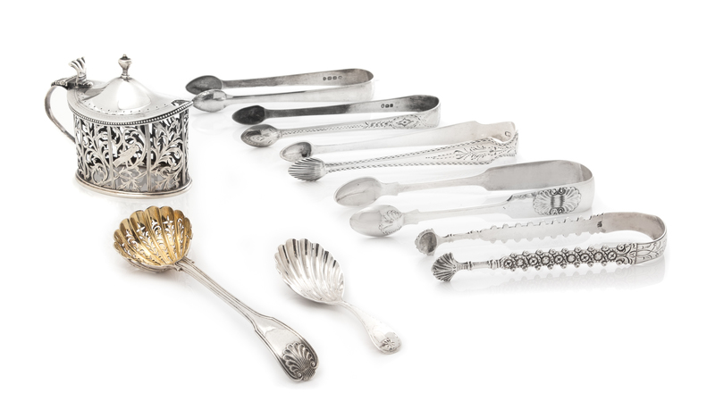comprising five sugar tongs, a sugar spoon, a bon bon spoon and a mustard pot without a glass liner.