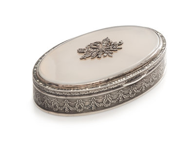 of oval form, the sides with a continuous band of foliate swags, the hardstone lid with an applied ribbon and torch cartouche.