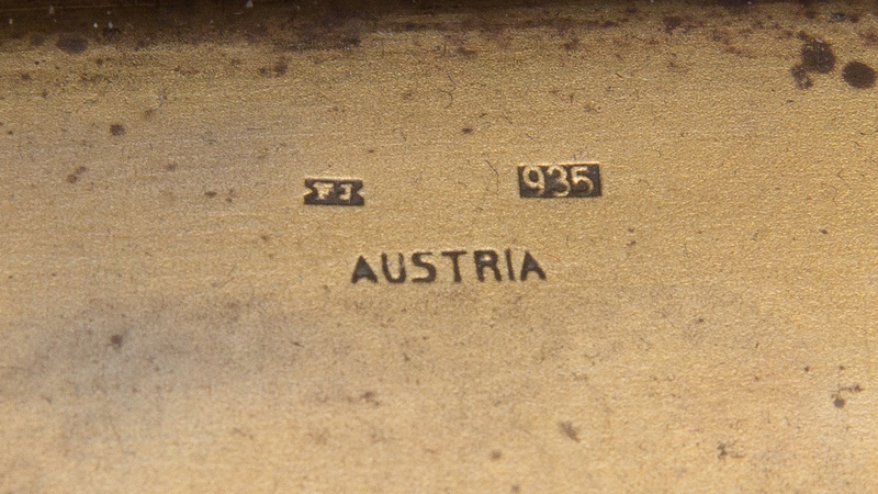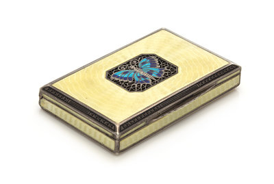 having a yellow guilloche enameled ground, the lid centered by a polychrome enameled butterfly.