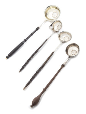 comprising two examples with baleen handles and two examples with turned wood handles, each having a silver coin inset to the base of the ladle bowl; 4 items total.
