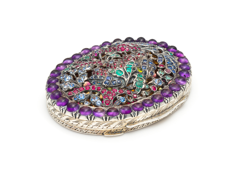of oval form, the pierced lid set with both natural and faux amethysts, sapphires, emeralds and rubies, the interior gilt.