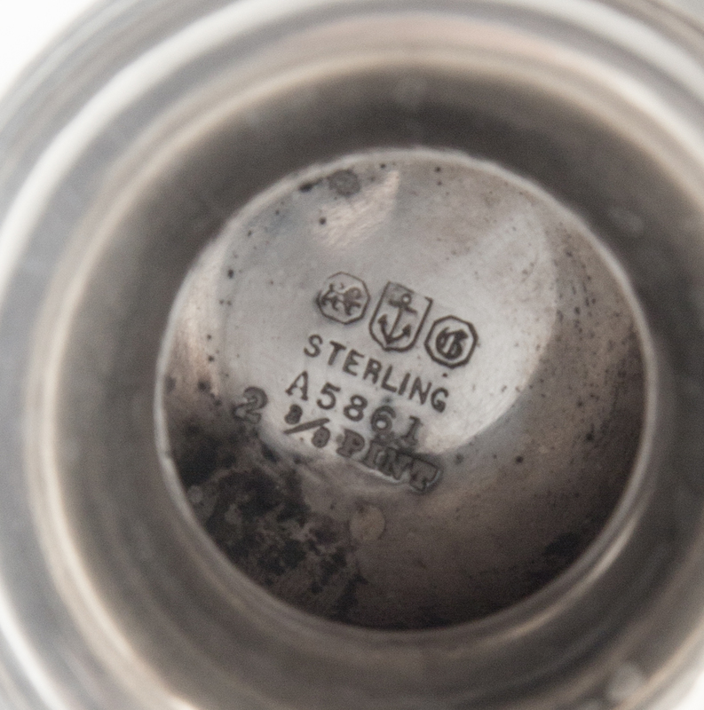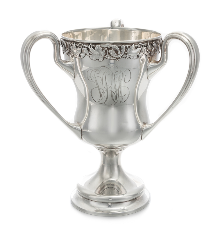the rim with a continuous foliate band, the body with an engraved monogram.