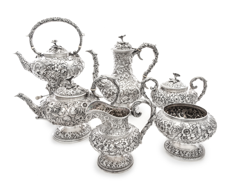 Repousse pattern, comprising a water kettle on stand, coffee pot, teapot, creamer, covered sugar and waste bowl.