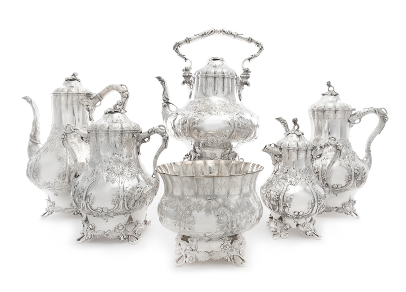 comprising a water kettle on stand, teapot, coffee pot, covered sugar, creamer and waste bowl, the service items having baluster form bodies decorated with repousse Chinoiserie garden scenes, the handles and spouts worked to show branches with applied vine and blossom motifs, the water kettle stand raised of figural legs ending in foliate feet.