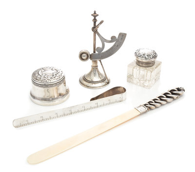 comprising an American silver postal scale and inkwell and an English silver page turner, letter opener, stamp box and ruler.