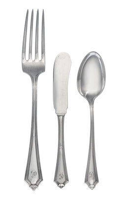 Plymouth pattern with a script G monogram, comprising: 2 dinner forks2 salad forks2 soup spoons12 teaspoons5 coffee spoons4 salt spoons3 butter spreaders