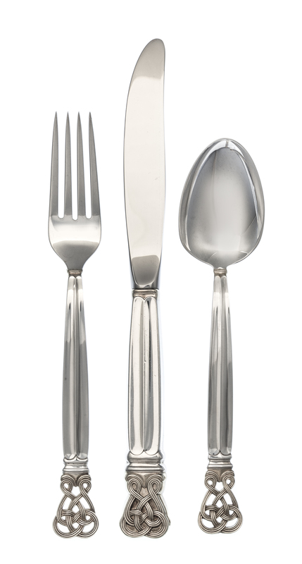 Celtic Weave pattern, comprising:12 dinner knives12 dinner forks12 salad forks12 soup spoons12 teaspoons1 master butter knife1 serving spoon1 pierced serving spoon1 sauce ladle1 serving fork1 jelly spoon