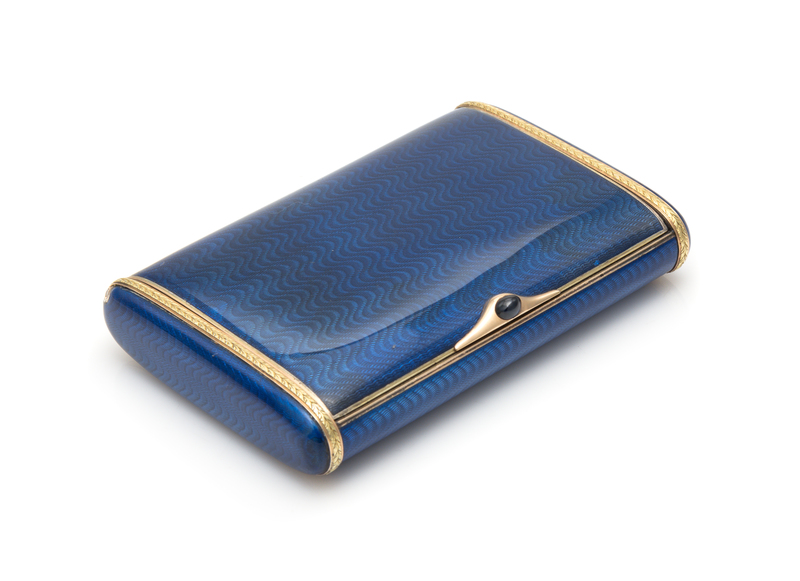 the rectangular case having cobalt enameling on a wavy engine turned ground with yellow gold foliate bands to the edges.
