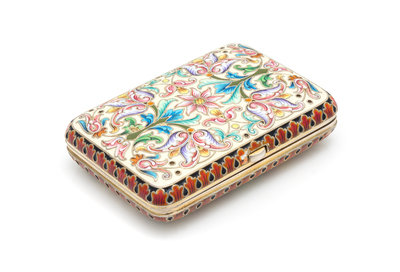 the case with polychrome floral and foliate scroll decoration on an ivory ground.