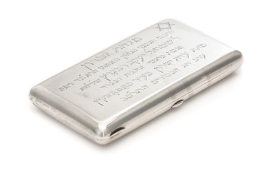 of rectangular form, the lid inscribed In Remembrance Forever, To Our Rabbi The Honorable, Wise, Truthful Rabbi Samuel Jacob Rabinowitz Shlita. Given With Love And Respect From Adath Jeshrun In Sapozkin On The Eve of The Holiday Of The First Born 1904.