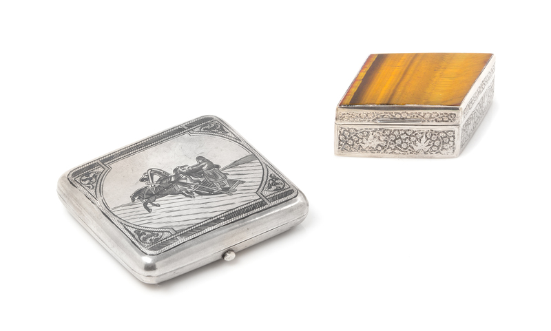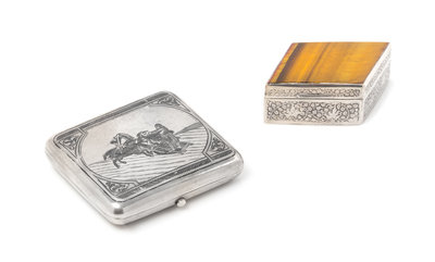 the lid worked to show a man driving a troika sled, together with a Tiger's eye inset box.