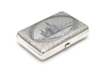 the lid centered by a Slavic town scene, the underside with foliate scroll and geometric decoration.